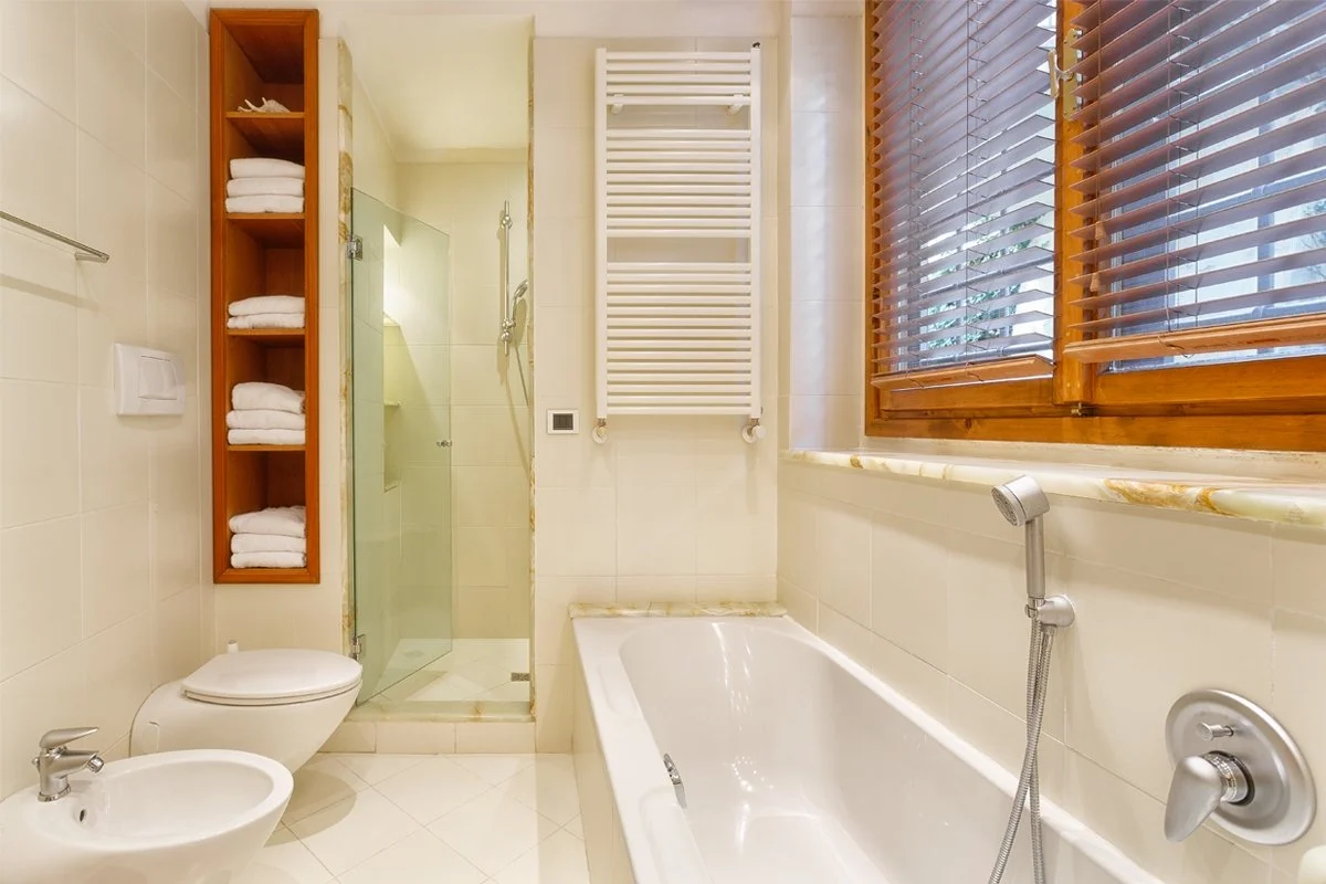 The Leonardo Master Suite has built-in wood closets and shelves, which lead to the en suite bathroom. This luxurious bathroom has a double sink and a bath and shower with a built-in marble seating and rainfall shower. The master bathroom is dramatically lit with recessed and under sink lighting, a lit magnifying mirror, and a dressing table bench.